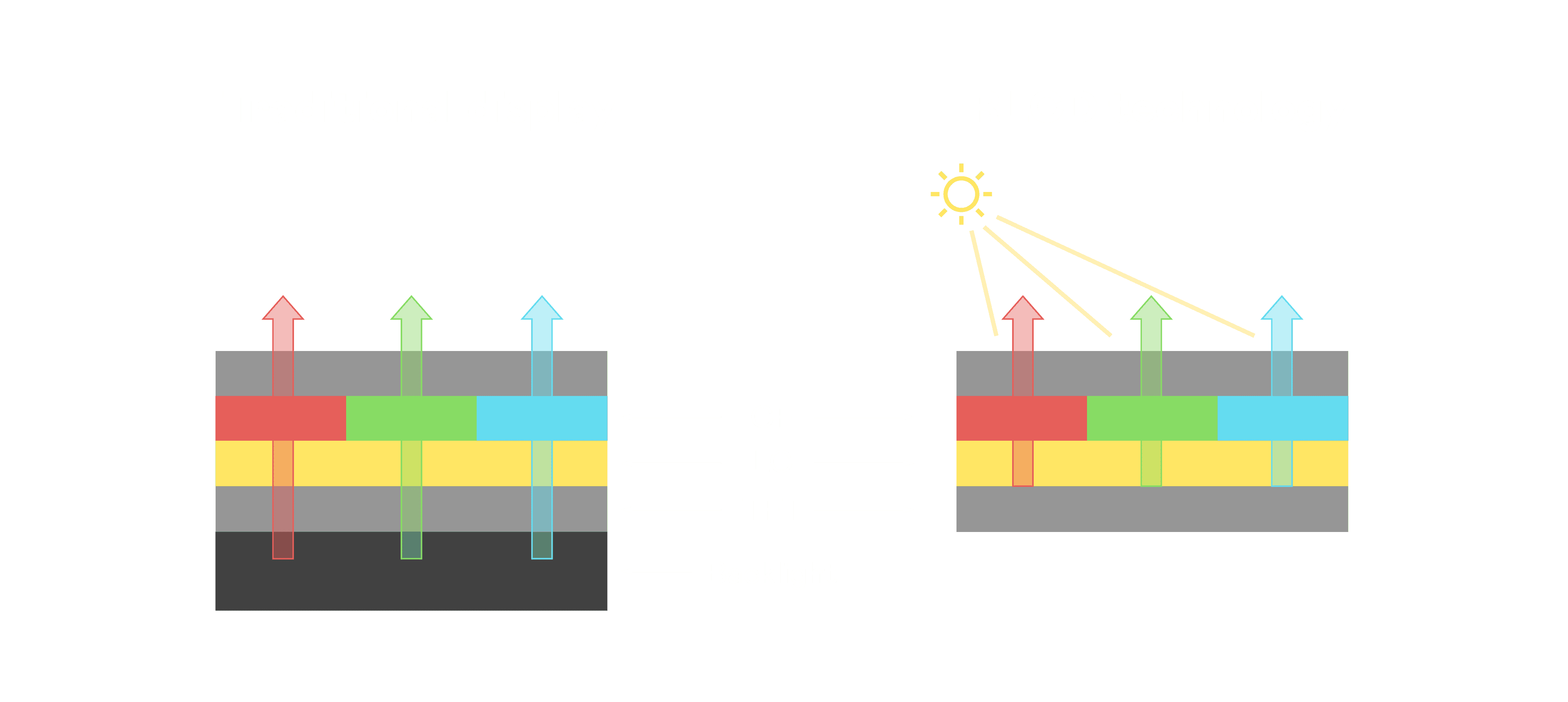 与传统需搭配背光单元的液晶显示相比,,反射式液晶技术不仅更省电、、、、更轻薄,,且即便在艳阳下仍能清晰显示。。。。此外,,,少了背光单元,,也大幅降低了 LED 蓝光伤害眼睛的疑虑。。。