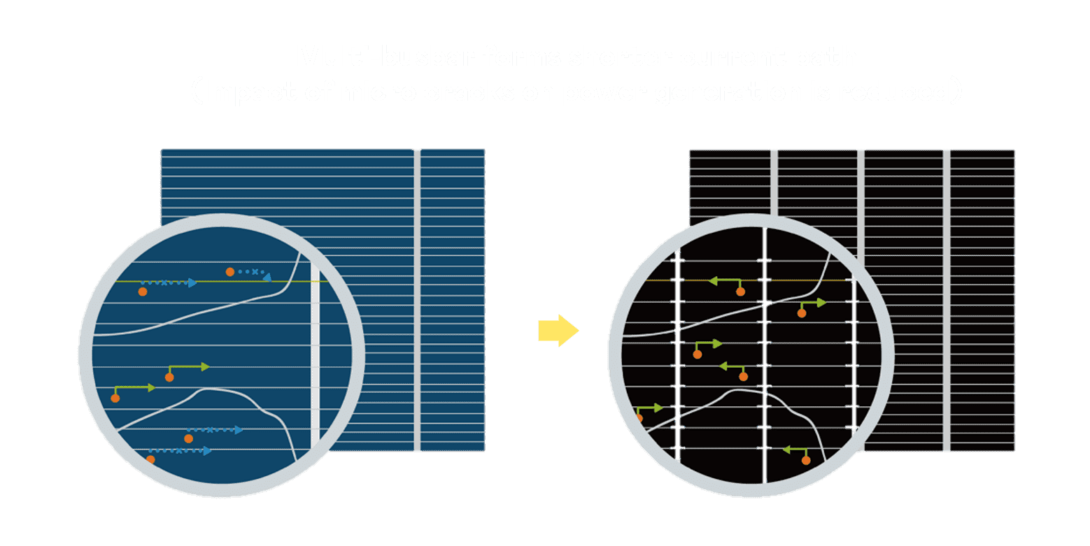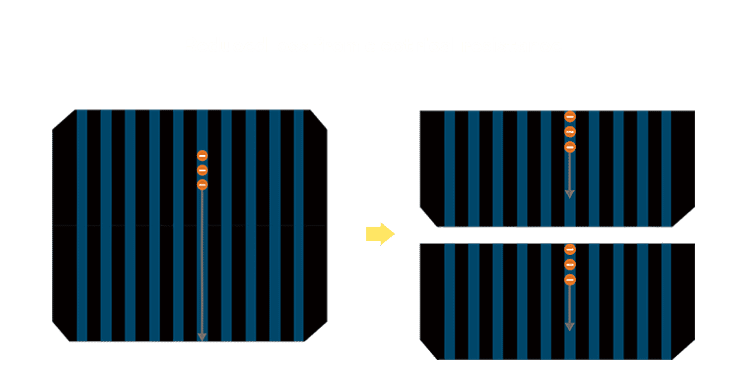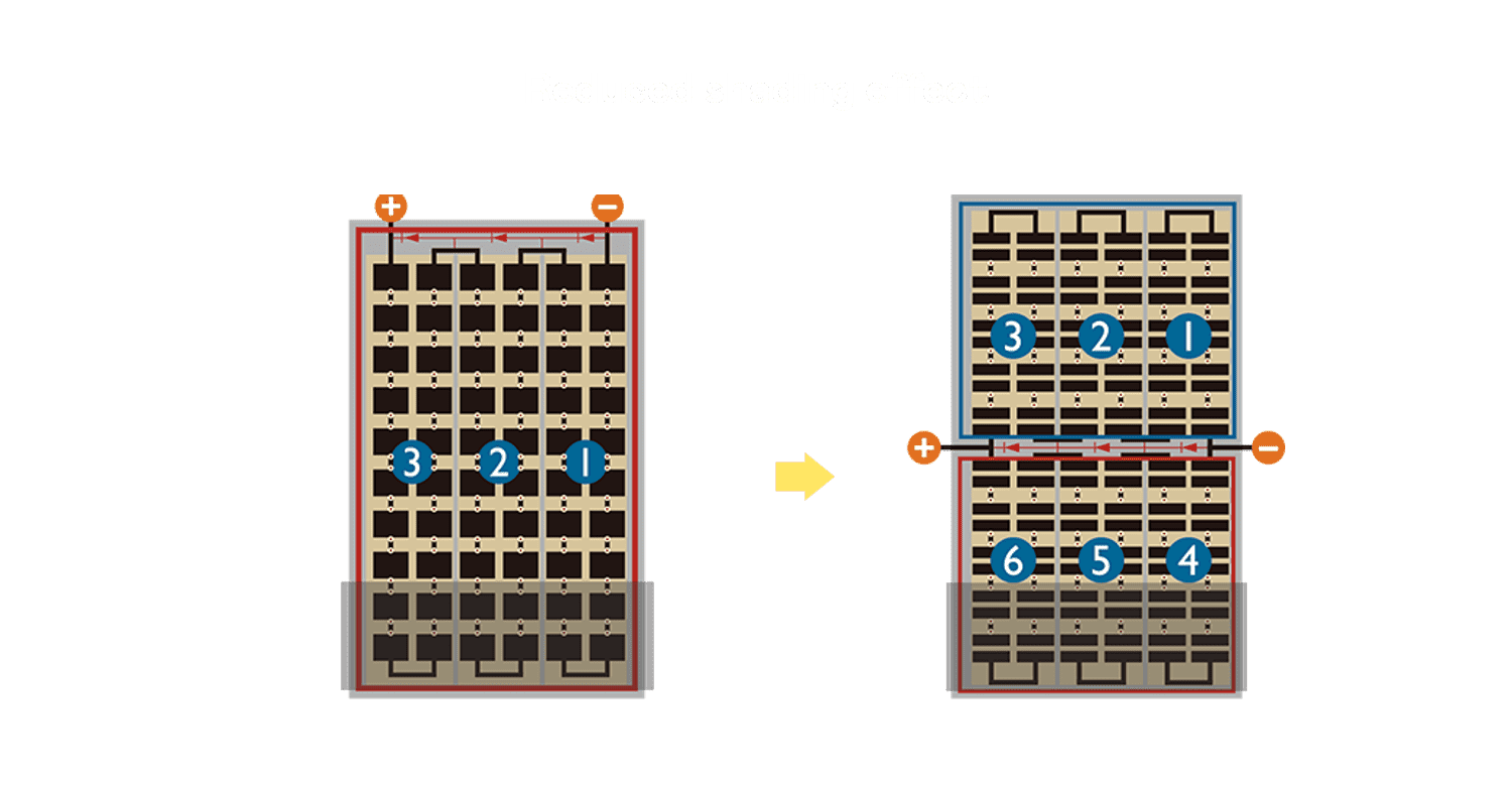 - 结合半切电池,,,降低遮阴影响、、提升模组抗隐裂能力、、并减少电阻损耗,,,进一步提升模组发电效能。。